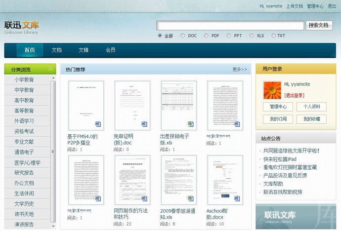 近日,联迅软件发布了国内第一款独立文库建站系统——联迅DocSoon文库建站系统。该系统功能丰富,可与国内知名文库网站豆丁网、百度文库网站相媲美。联迅文库系统适用于教育机构、政府机构、日报社、公司企业等行业及单位,方便用户搭建起一套综合性的文档共享交互平台。 演示网站:http://doc.demo.linksoon.net